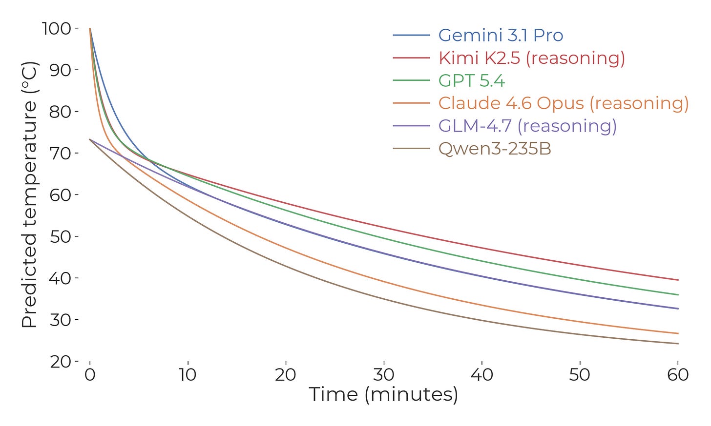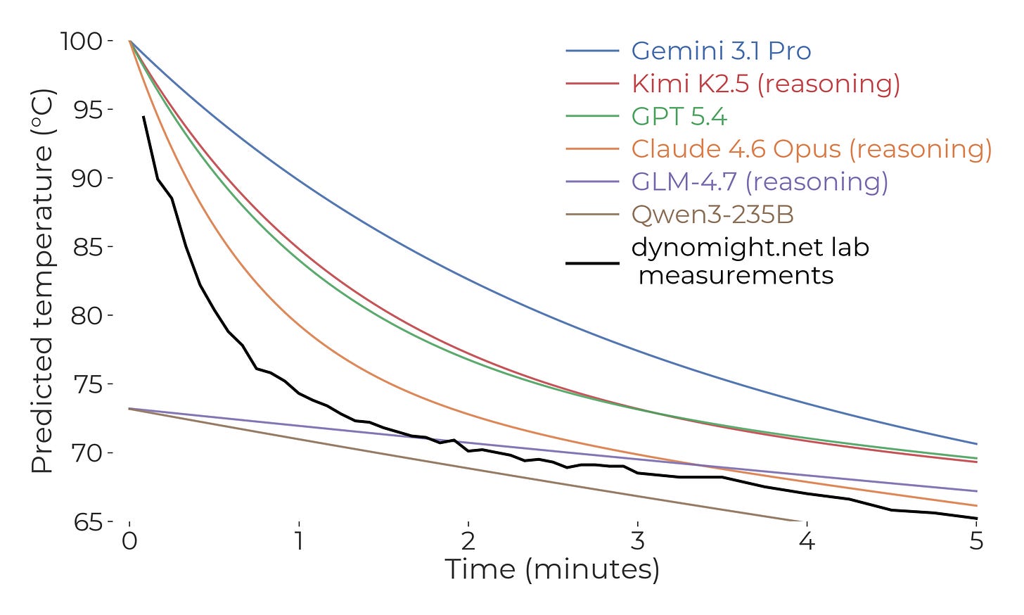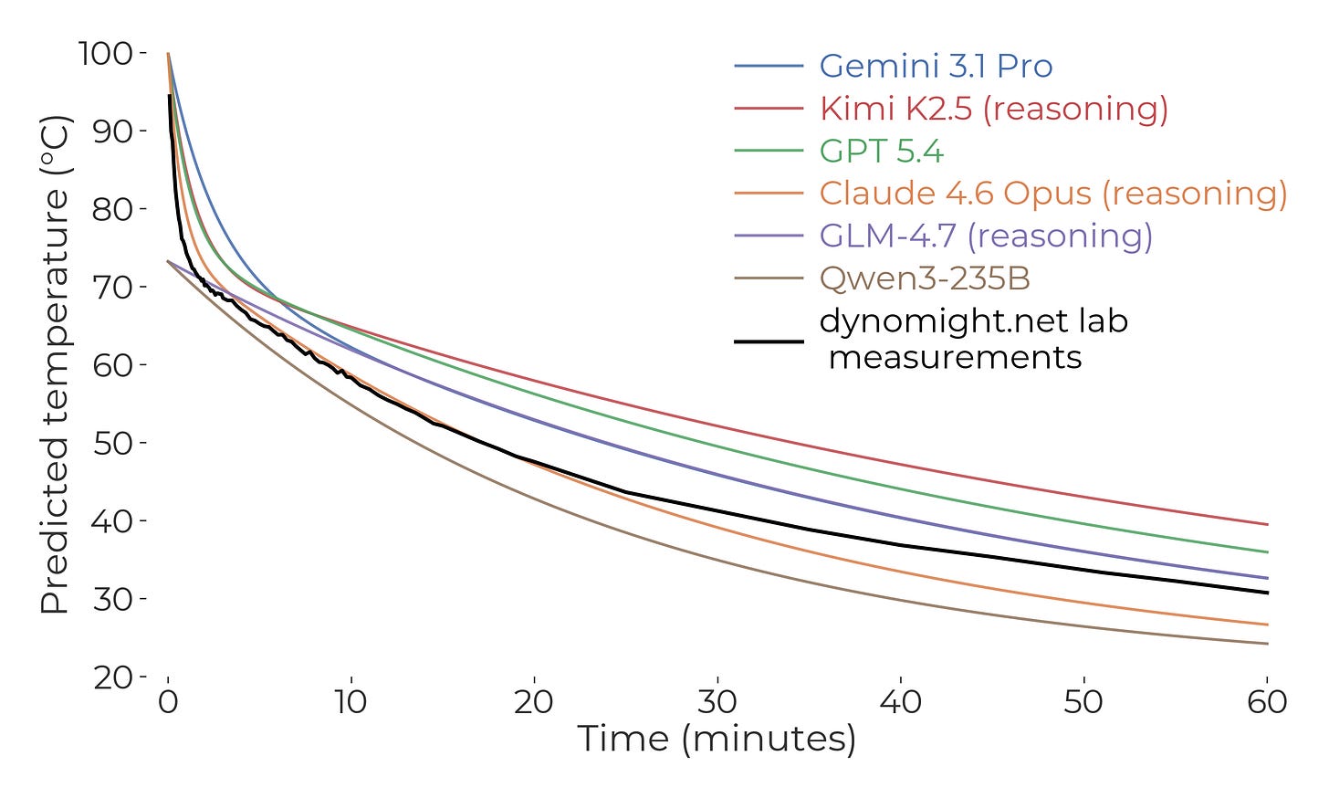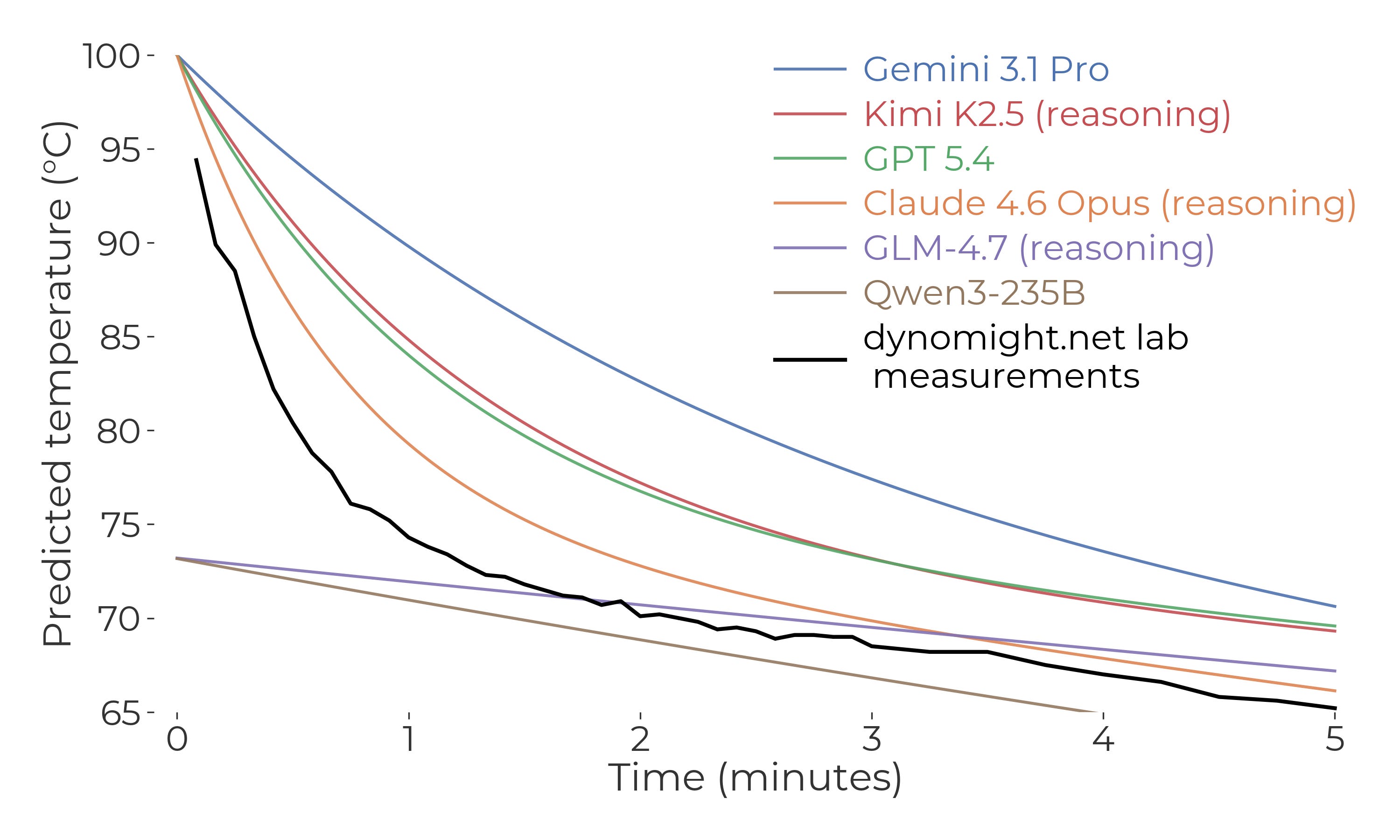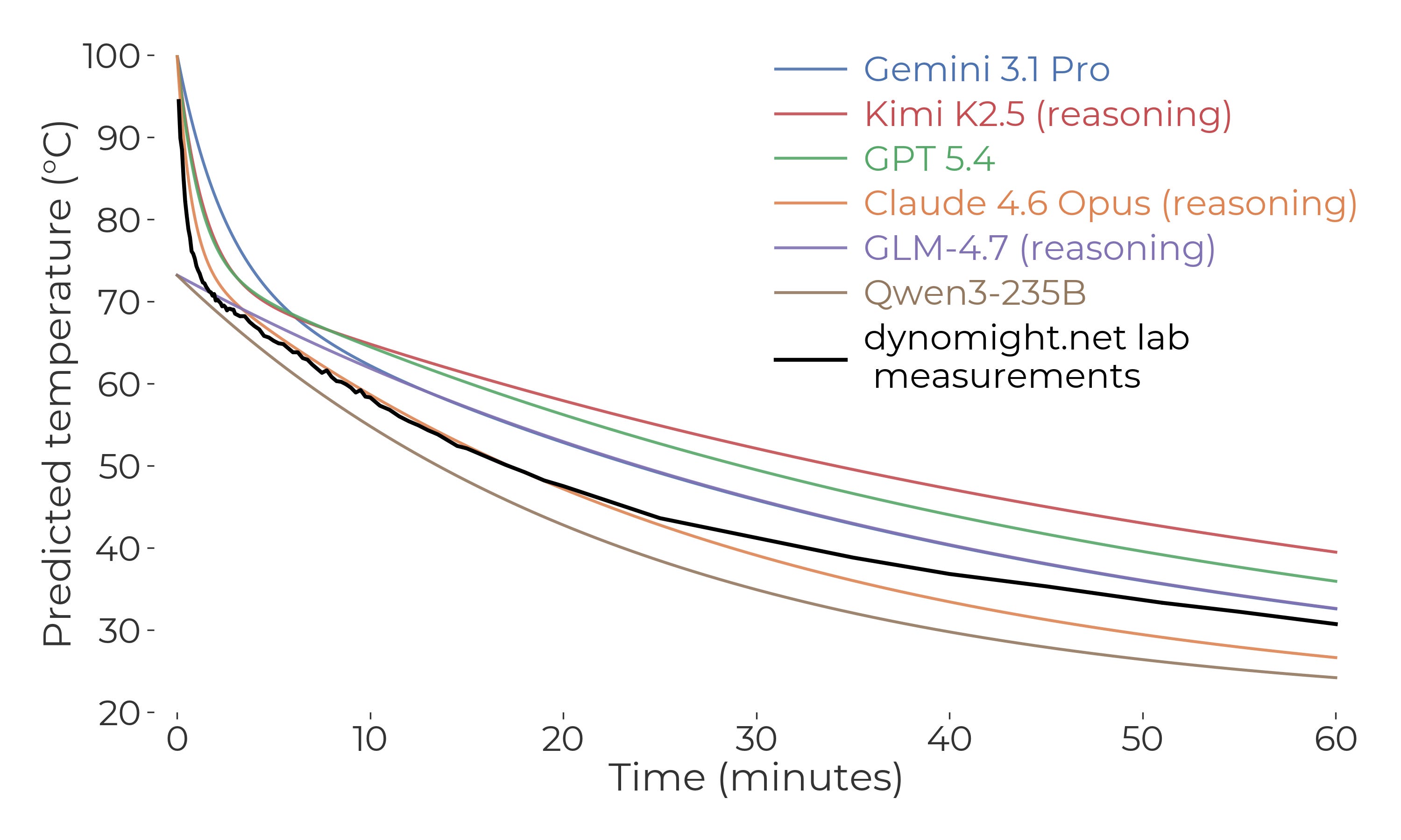 That said, what surprised me about the predictions was how quickly the temperature dropped in the first few minutes, and how slowly it dropped later on. But experimentally, it dropped even faster early on, and even slower towards the end. So if you wanted to ensemble my intuition with the LLM, I guess my intuition would get a weight of zero.