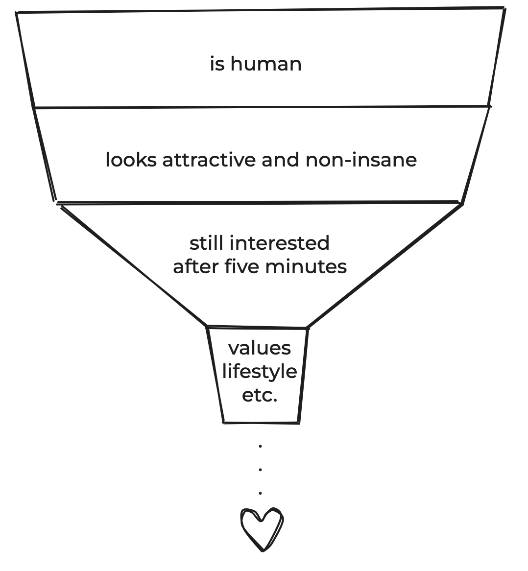 Basically, a key “filter” in finding love is finding someone where you both feel optimistic after talking for five minutes. Speed dating is (somewhat / sometimes) effective because it efficiently crams a lot of people into the top of that filter.