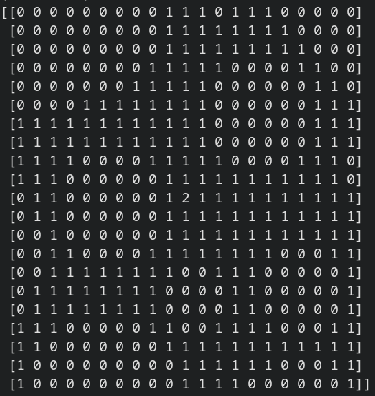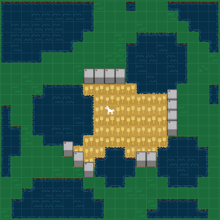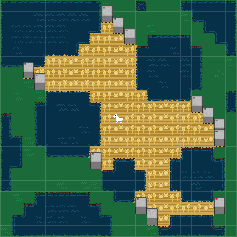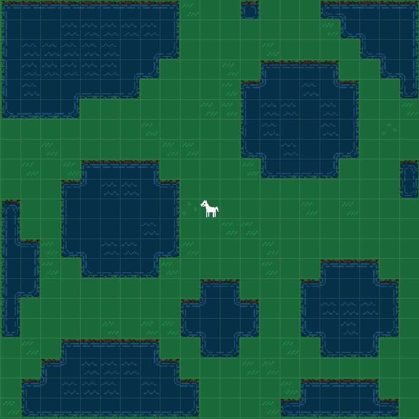 I knew this would be slow and tedious, but the empirical slowness and tedium exceeded my expectations. After getting as far as shown above, I couldn’t take it anymore and decided to use image processing instead. I took a screenshot and then wrote a script that breaks up the image into tiles and then counts how many pixels in each chunk match the background color for water and for field. Then I manually added the horse. This gave me an array with 0 for water, 1 for field, and 2 for horse.