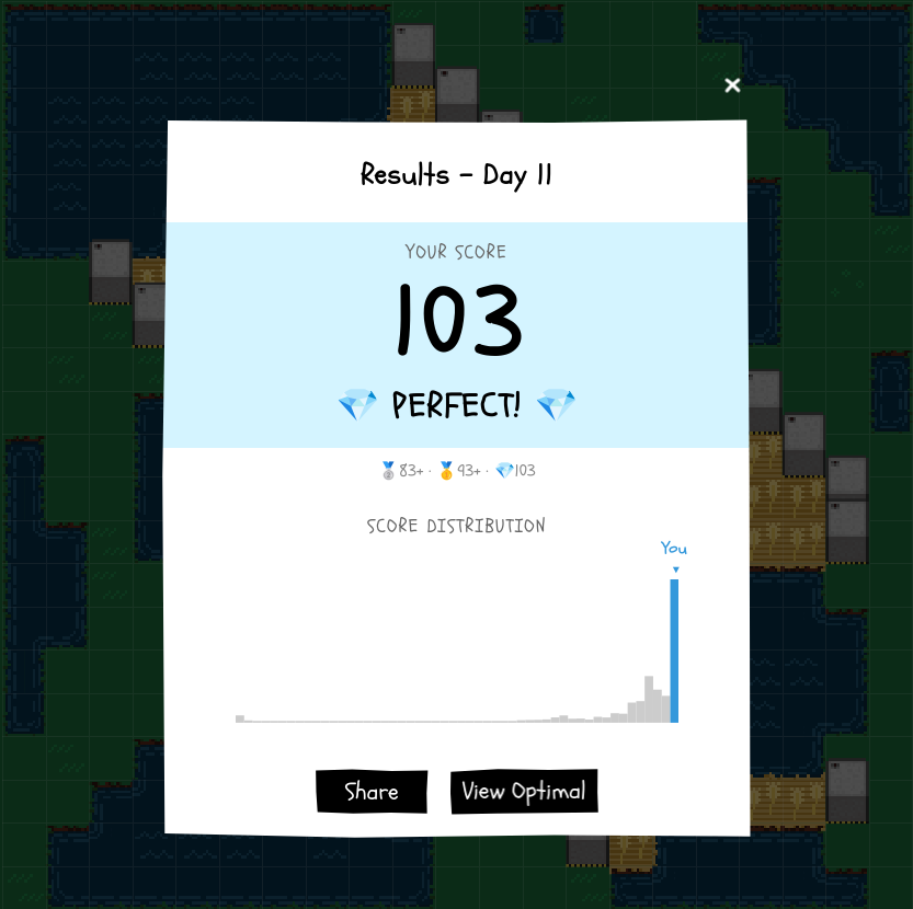 For fun, I ran the same solver on all the previous days. Here I ran into some edge cases with the image processing for extracting the maps. Turns out, my computer slightly dims windows that aren’t focused, and the utility I was using to sample the colors for the website itself took focus. This took probably five times longer than everything integer-programming related and was extremely annoying.