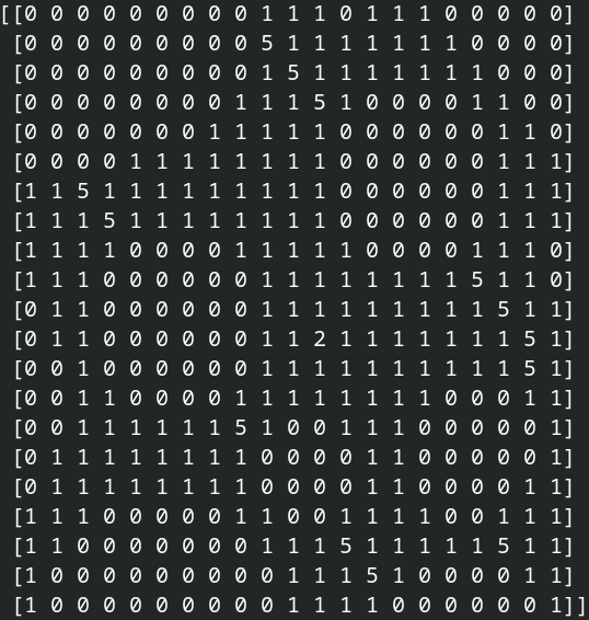 So I wrote some code to take the map as an array of integers and create all those constraints. Then I called scipy.optimize.milp. A fraction of a second later I had this solution, where I used 5 to indicate a wall.