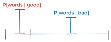 OK. But now here you are reading these words. If they seem bad/good, then that raises the odds that this particular post is worthless/non-worthless. For the sake of argument again, say you find these words mildly promising, meaning that a good post is 1.5× more likely than a worthless post to contain words with this level of quality.