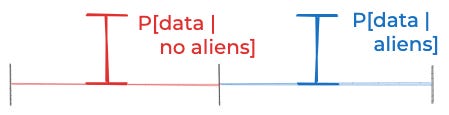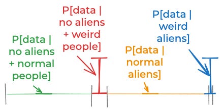 This is where my first model of aliens went wrong. My prior P[aliens] was not wrong. (Not to me.) The mistake was in assigning the same value to P[data | aliens] and P[data | no aliens]. Sure, I think the probability of all our alien-esque data is equally likely given aliens and given no-aliens. But that’s only true for certain kinds of aliens, and certain kinds of no-aliens. And my prior for those kinds of aliens is much lower than for those kinds of non-aliens.