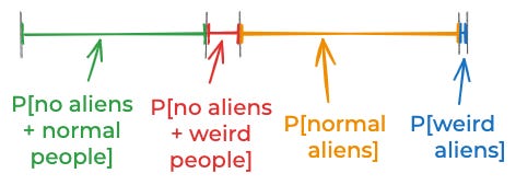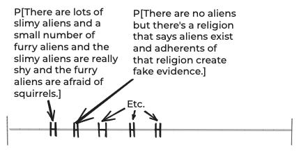 In the case of aliens, the space of things that could be true might include, “There are lots of slimy aliens and a small number of furry aliens and the slimy aliens are really shy and the furry aliens are afraid of squirrels.” So, in principle, what you should do is divide up the space of things that might be true into tons of extremely detailed things and give a probability to each.