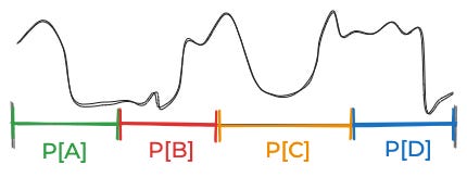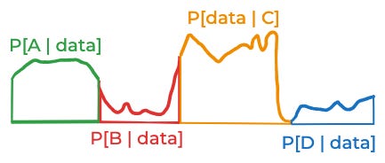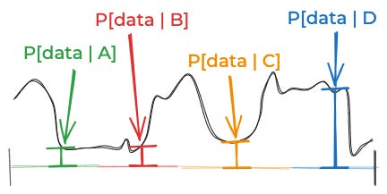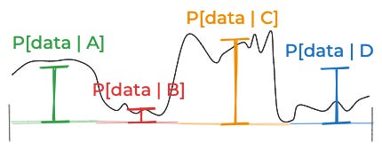 That approximation was pretty good. But the reason it was good is that we started out with a good discretization of the space of things that might be true: One where the likelihood of the data didn’t vary too much for the different possibilities inside of A, B, C, and D. Imagine the likelihood of the data—if you were able to think about all the infinite possibilities one by one—looked like this: