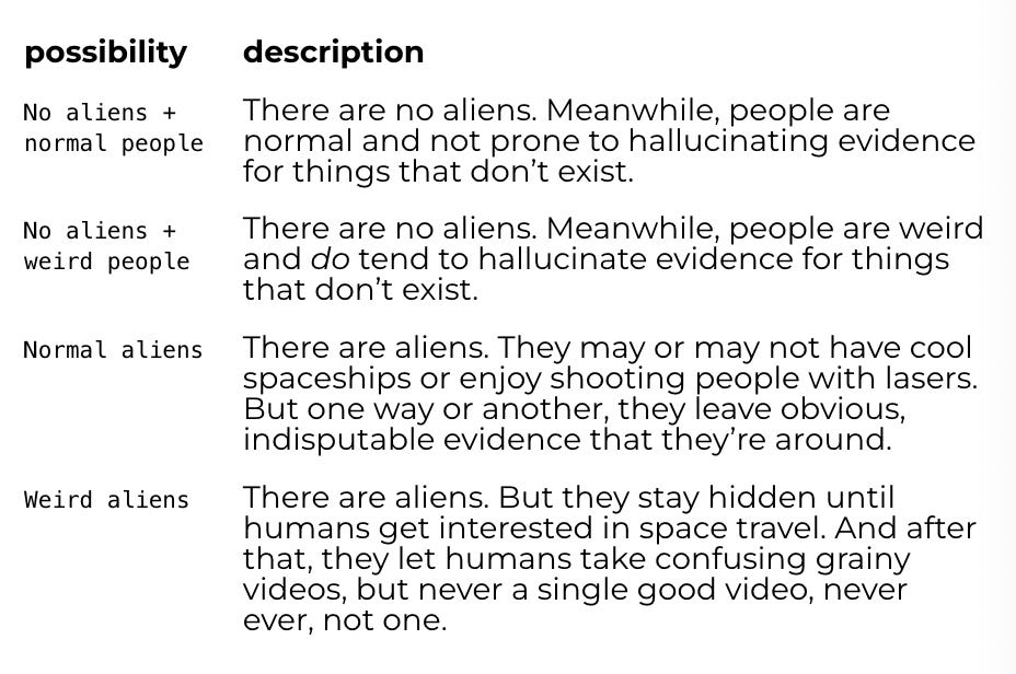 P[aliens] ≈ P[no aliens] ≈ 50%.Meanwhile, here on our actual world, we have lots of weird alien-esque evidence, like the Gimbal video, the Go Fast video, the FLIR1 video, the Wow! signal, government reports on unidentified aerial phenomena, and lots of pilots that report seeing “tic-tacs” fly around in physically impossible ways. Call all that stuff data. If aliens weren’t here, then it seems hard to explain all that stuff. So it seems like P[data | no aliens] should be some low number.