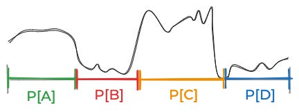 So what do we do in practice? We simplify, usually by limiting creating grouping the space of things that could be true into some small number of discrete categories. For the above curve, you might break things down into these four equally-plausible possibilities.
