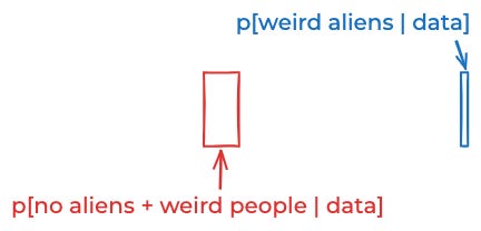 P[data | weird aliens] ≈ P[data | no aliens + weird people].If we combine those assumptions, now we only get a 10% posterior probability of aliens.