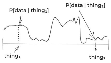 After you’ve done that, you can look at the data. For each thing that could be true, you need to think about the probability of the data. Since there’s an infinite number of things that could be true, that’s an infinite number of probabilities you need to specify. You could picture it as some curve like this: