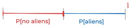 Let me show you what I mean. Say you’re wondering if there are aliens on Earth. As far as we know, there’s no reason aliens shouldn’t have emerged out of the random swirling of molecules on some other planet, developed a technological civilization, built spaceships, and shown up here. So it seems reasonable to choose a prior it’s equally plausible that there are aliens or that there are not, i.e. that